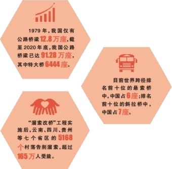 伴隨著經(jīng)濟(jì)發(fā)展和技術(shù)水平的提高,如今,不論是橋梁數(shù)量,還是橋梁技術(shù),中國橋梁的“金字招牌”早已享譽(yù)世界。港珠澳大橋、蘇通大橋、丹昆特大橋、矮寨特大懸索橋……一大批世界級(jí)橋梁翻山、越江、跨海,讓無數(shù)天塹變?yōu)橥ㄍ?,也向世界展示著“中國建造”的非凡?shí)力。