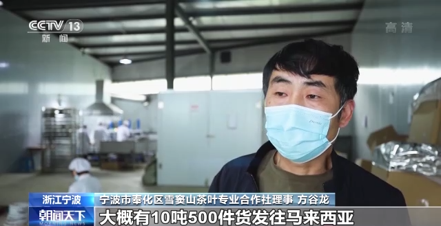 寧波市奉化區(qū)雪竇山茶葉專業(yè)合作社理事 方谷龍:我們這個(gè)集裝箱大概有10噸500件貨發(fā)往馬來(lái)西亞,這個(gè)是我們今年第6批出口。