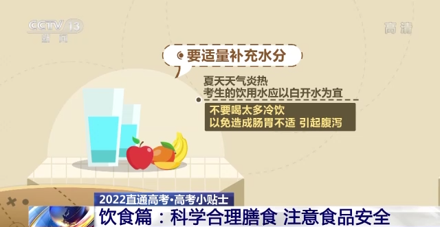 同時,要適量補充水分。夏天天氣炎熱,考生的飲用水應(yīng)以白開水為宜,不要喝太多冷飲,以免造成腸胃不適,引起腹瀉。如遇高溫天氣,建議考生適當(dāng)補充淡鹽水,多吃新鮮蔬果,清淡飲食。