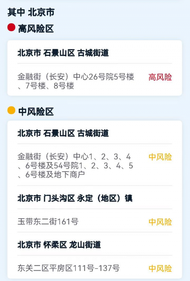 北京現(xiàn)有高、中風(fēng)險(xiǎn)區(qū)1+3個(gè)