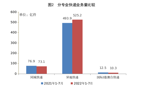 1-7月,全國快遞服務(wù)企業(yè)業(yè)務(wù)量累計完成608.6億件,同比增長4.3%;業(yè)務(wù)收入累計完成5880.4億元,同比增長3.7%。其中,同城業(yè)務(wù)量累計完成73.1億件,同比下降4.9%;異地業(yè)務(wù)量累計完成525.2億件,同比增長6.3%;國際/港澳臺業(yè)務(wù)量累計完成10.3億件,同比下降17.8%。