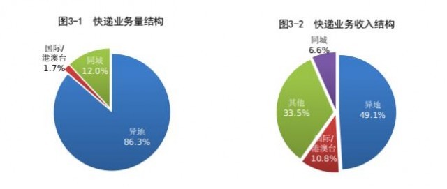 1-7月,同城、異地、國際/港澳臺快遞業(yè)務(wù)量分別占全部快遞業(yè)務(wù)量的12.0%、86.3%和1.7%;業(yè)務(wù)收入分別占全部快遞業(yè)務(wù)收入的6.6%、49.1%和10.8%。與去年同期相比,同城快遞業(yè)務(wù)量的比重下降1.2個百分點,異地快遞業(yè)務(wù)量的比重上升1.6個百分點,國際/港澳臺業(yè)務(wù)量的比重下降0.4個百分點。