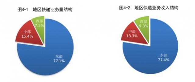 1-7月,東、中、西部地區(qū)快遞業(yè)務(wù)量比重分別為77.1%、15.4%和7.5%,業(yè)務(wù)收入比重分別為77.4%、13.3%和9.3%。與去年同期相比,東部地區(qū)快遞業(yè)務(wù)量比重下降1.5個百分點,快遞業(yè)務(wù)收入比重下降1.1個百分點;中部地區(qū)快遞業(yè)務(wù)量比重上升1.2個百分點,快遞業(yè)務(wù)收入比重上升0.6個百分點;西部地區(qū)快遞業(yè)務(wù)量比重上升0.3個百分點,快遞業(yè)務(wù)收入比重上升0.5個百分點。