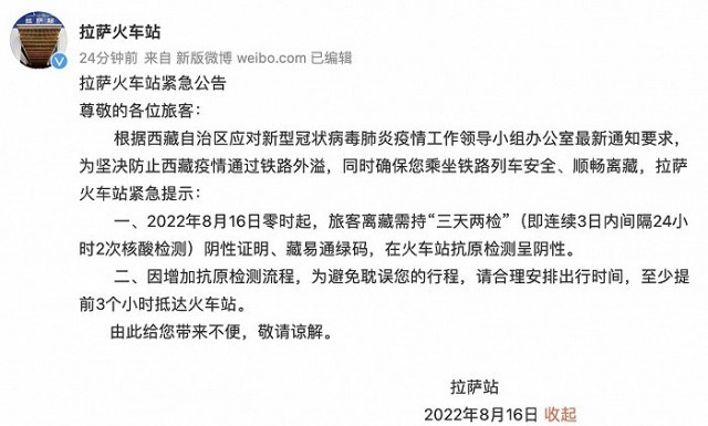 央視網(wǎng)消息:據(jù)@拉薩火車站 微博消息,根據(jù)西藏自治區(qū)應(yīng)對(duì)新型冠狀病毒肺炎疫情工作領(lǐng)導(dǎo)小組辦公室最新通知要求,為堅(jiān)決防止西藏疫情通過鐵路外溢,同時(shí)確保您乘坐鐵路列車安全、順暢離藏,拉薩火車站緊急提示:8月16日零時(shí)起,旅客離藏需持“三天兩檢”(即連續(xù)3日內(nèi)間隔24小時(shí)2次核酸檢測(cè))陰性證明、藏易通綠碼,在火車站抗原檢測(cè)呈陰性。因增加抗原檢測(cè)流程,請(qǐng)至少提前3個(gè)小時(shí)抵達(dá)火車站。