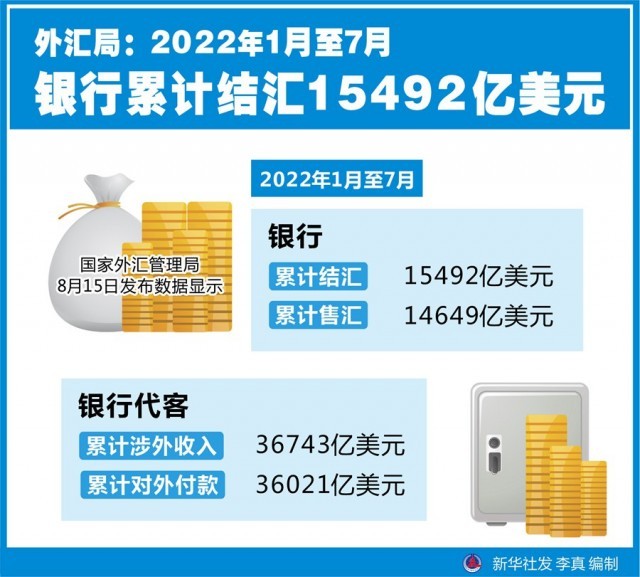 新華社北京8月15日電(記者劉開雄)國家外匯管理局15日發(fā)布數(shù)據(jù)顯示,今年1月至7月,銀行累計結(jié)匯15492億美元,累計售匯14649億美元;銀行代客累計涉外收入36743億美元,累計對外付款36021億美元。