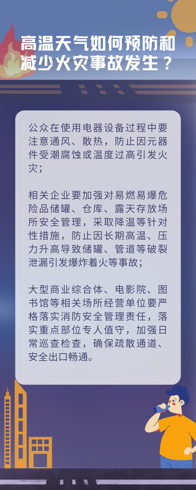 高溫天氣如何有效預(yù)防和減少火災(zāi)事故發(fā)生?應(yīng)急管理部消防救援局發(fā)布消防安全提示,公眾在使用電器設(shè)備過程中要注意通風(fēng)、散熱,防止因元器件受潮腐蝕或溫度過高引發(fā)火災(zāi);相關(guān)企業(yè)要加強(qiáng)對易燃易爆危險品儲罐、倉庫、露天存放場所安全管理,采取降溫等針對性措施,防止因長期高溫、壓力升高導(dǎo)致儲罐、管道等破裂泄漏引發(fā)爆炸著火等事故;大型商業(yè)綜合體、電影院、圖書館等相關(guān)場所經(jīng)營單位要嚴(yán)格落實消防安全管理責(zé)任,落實重點(diǎn)部位專人值守,加強(qiáng)日常巡查檢查,確保疏散通道、安全出口暢通。