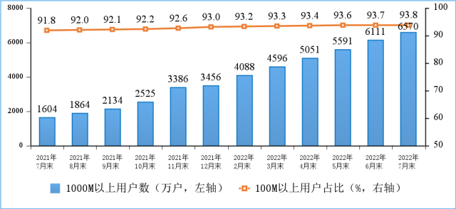 固定寬帶接入用戶規(guī)模穩(wěn)步增長,千兆用戶數(shù)持續(xù)擴大。截至7月末,三家基礎(chǔ)電信企業(yè)的固定互聯(lián)網(wǎng)寬帶接入用戶總數(shù)達5.66億戶,比上年末凈增3070萬戶。其中,100Mbps及以上接入速率的固定互聯(lián)網(wǎng)寬帶接入用戶達5.31億戶,占總用戶數(shù)的93.8%,占比較上年末提升0.8個百分點;1000Mbps及以上接入速率的固定互聯(lián)網(wǎng)寬帶接入用戶達6570萬戶,比上年末凈增3112萬戶,占總用戶數(shù)的11.6%。