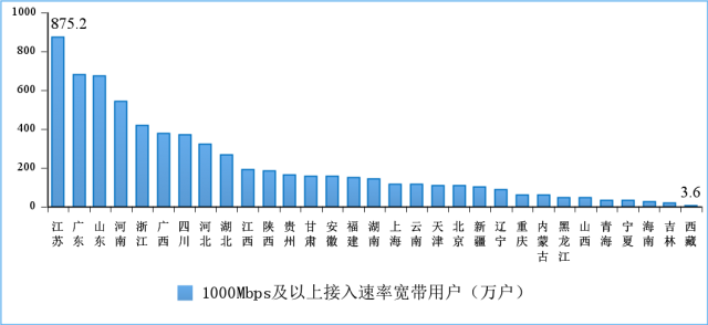 圖9 2022年7月份1000Mbps及以上接入速率的寬帶接入用戶各省情況