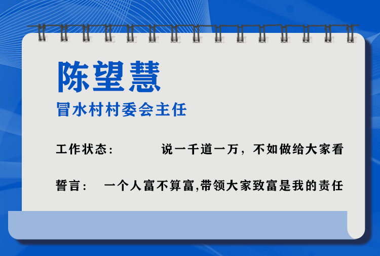 2011年,陳望慧加入了中國(guó)共產(chǎn)黨。這一年,冒水村換屆選舉,陳望慧作為村上的致富能人,在村黨支部多次動(dòng)員和群眾的勸說(shuō)下,放下經(jīng)營(yíng)多年、收入可觀的飯店回村,當(dāng)選為冒水村村委會(huì)主任。