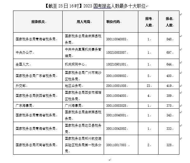 截至10月25日16時,2023國考報名首日的“人氣之星”是國家稅務(wù)總局青海省稅務(wù)局曲麻萊縣稅務(wù)局這一職位,僅招錄1人,已有848人提交報名申請,報名首日競爭比已高達848:1。