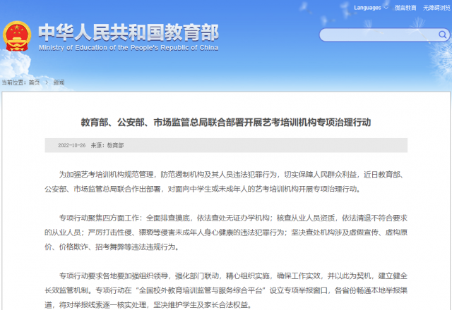 據(jù)教育部網(wǎng)站消息,為加強藝考培訓(xùn)機構(gòu)規(guī)范管理,防范遏制機構(gòu)及其人員違法犯罪行為,切實保障人民群眾利益,近日教育部、公安部、市場監(jiān)管總局聯(lián)合作出部署,對面向中學(xué)生或未成年人的藝考培訓(xùn)機構(gòu)開展專項治理行動。