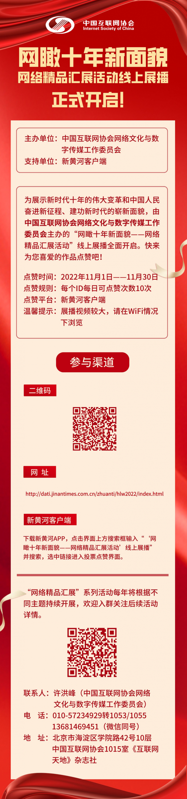 為展示新時(shí)代十年的偉大變革和中國(guó)人民奮進(jìn)新征程、建功新時(shí)代的嶄新面貌,11月1日,由中國(guó)互聯(lián)網(wǎng)協(xié)會(huì)網(wǎng)絡(luò)文化與數(shù)字傳媒工作委員會(huì)(以下簡(jiǎn)稱工作委員會(huì))主辦的“網(wǎng)絡(luò)精品匯展”第三季“網(wǎng)瞰十年新面貌”網(wǎng)絡(luò)精品匯展活動(dòng)線上展播啟動(dòng),在網(wǎng)絡(luò)空間唱響正能量。歡迎廣大網(wǎng)民點(diǎn)擊“閱讀原文”進(jìn)入活動(dòng)頁(yè)面為喜愛(ài)的作品點(diǎn)贊,展播時(shí)間截至11月30日。