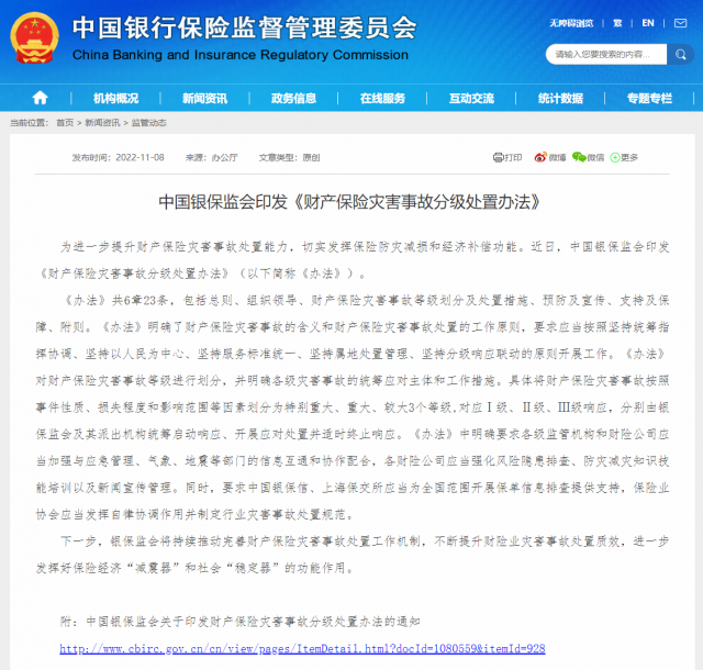 銀保監(jiān)會網(wǎng)站11月8日消息,為進一步提升財產(chǎn)保險災(zāi)害事故處置能力,切實發(fā)揮保險防災(zāi)減損和經(jīng)濟補償功能。近日,中國銀保監(jiān)會印發(fā)《財產(chǎn)保險災(zāi)害事故分級處置辦法》(以下簡稱《辦法》)。