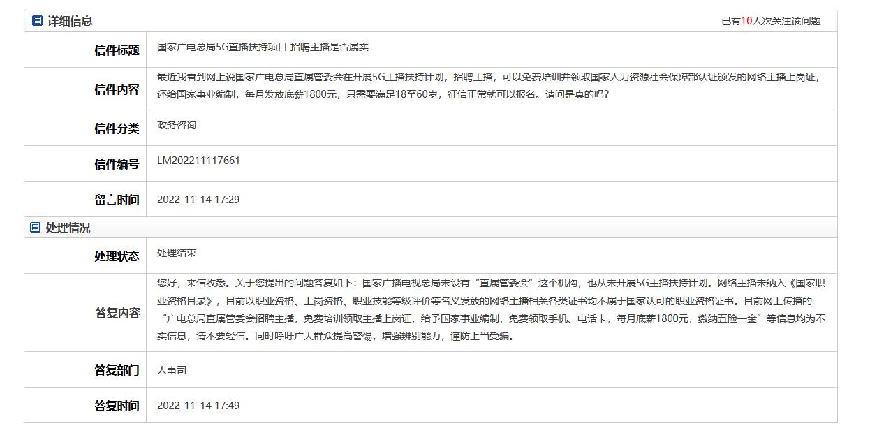 中新網(wǎng)11月14日電 針對(duì)網(wǎng)上流傳“國(guó)家廣電總局直屬管委會(huì)在開展5G主播扶持計(jì)劃并招聘主播,可以免費(fèi)培訓(xùn)并領(lǐng)取國(guó)家人力資源社會(huì)保障部認(rèn)證頒發(fā)的網(wǎng)絡(luò)主播上崗證,還給國(guó)家事業(yè)編制,每月發(fā)放底薪1800元”,國(guó)家廣電總局人事司14日回應(yīng)稱,“國(guó)家廣播電視總局未設(shè)有‘直屬管委會(huì)’這個(gè)機(jī)構(gòu),也從未開展5G主播扶持計(jì)劃?!?/p>