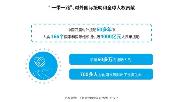 中國(guó)先后批準(zhǔn)或加入了30余項(xiàng)國(guó)際人權(quán)文書(shū),其中包括6項(xiàng)聯(lián)合國(guó)核心人權(quán)條約;累計(jì)共向166個(gè)國(guó)家和國(guó)際組織提供了援助,派遣60多萬(wàn)名援助人員;多次無(wú)條件免除重債窮國(guó)和最不發(fā)達(dá)國(guó)家對(duì)華到期政府無(wú)息貸款債務(wù)。在聯(lián)合國(guó)維和行動(dòng)中,中國(guó)是安理會(huì)常任理事國(guó)第一大出兵國(guó),30多年來(lái)累計(jì)派出維和官兵5萬(wàn)余人次。共建“一帶一路”已成為助力各國(guó)發(fā)展、深受世界歡迎的新興國(guó)際公共產(chǎn)品,據(jù)世界銀行研究報(bào)告,到2030年,將使相關(guān)國(guó)家760萬(wàn)人擺脫極端貧困、3200萬(wàn)人擺脫中度貧困。新冠肺炎疫情暴發(fā)以來(lái),中國(guó)努力促進(jìn)新冠疫苗在全球范圍內(nèi)公平合理分配,成為全球?qū)ν馓峁┮呙鐢?shù)量最多的國(guó)家。