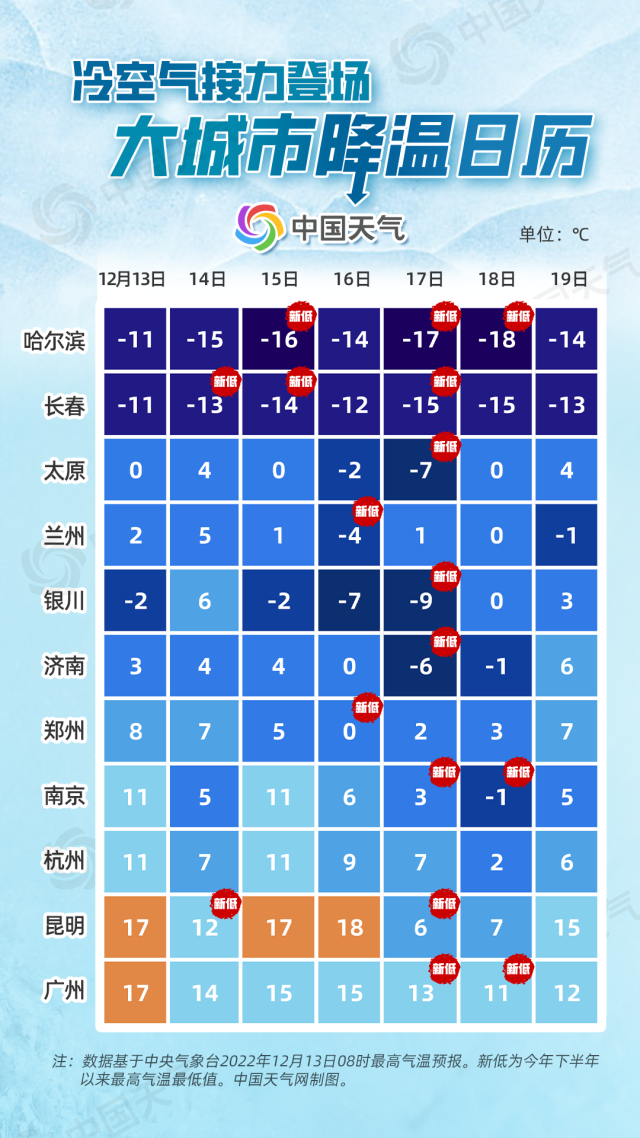 大城市中,廣州、南京、濟南、銀川、太原、哈爾濱等地都將在17日前后集中創(chuàng)下今年下半年來最高氣溫的最低值,冷空氣甚至能翻上高原影響昆明,17日昆明的最高氣溫會陡降至6℃,單日降幅12℃,如此低的氣溫在12月中旬也不多見。