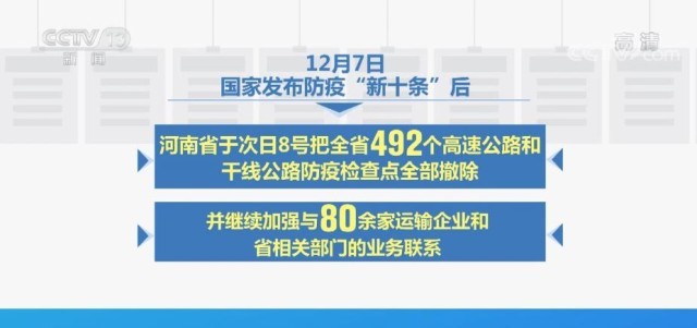 據(jù)了解,12月7日,國家發(fā)布防疫“新十條”后,河南省于次日把全省492個高速公路和干線公路防疫檢查點全部撤除,并繼續(xù)加強與80余家運輸企業(yè)和省相關部門的業(yè)務聯(lián)系,充分發(fā)揮“12328服務監(jiān)督熱線+三級調度”機制作用,每日收集運輸受阻問題,以便及時解決問題。