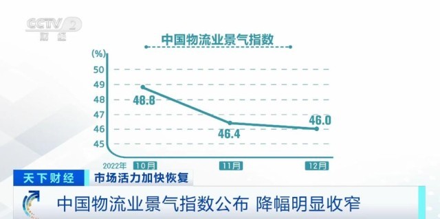 2022年12月份,中國物流業(yè)景氣指數(shù)為46%,較上月回落0.4個百分點,降幅較上月收窄2個百分點。