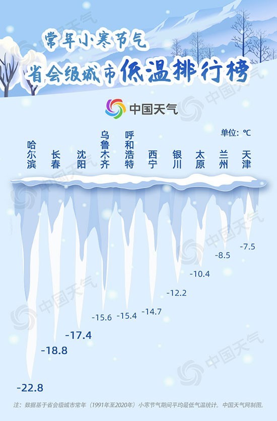 從中國天氣網(wǎng)1991-2020年小寒節(jié)氣省會級城市低溫排行榜可以看出,上榜的均為北方城市,其中哈爾濱以-22.8℃位列榜首,長春和沈陽分別位居第二、第三。