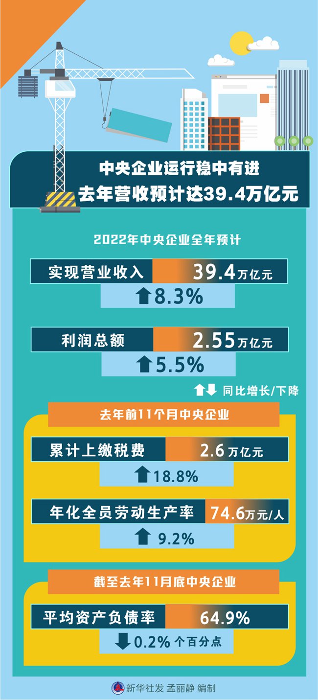 新華社北京1月5日電(記者王希)2022年,國資央企統(tǒng)籌疫情防控和企業(yè)生產經營,統(tǒng)籌發(fā)展和安全,推動經濟運行實現穩(wěn)中有進,中央企業(yè)全年預計實現營業(yè)收入39.4萬億元、利潤總額2.55萬億元,同比分別增長8.3%和5.5%。