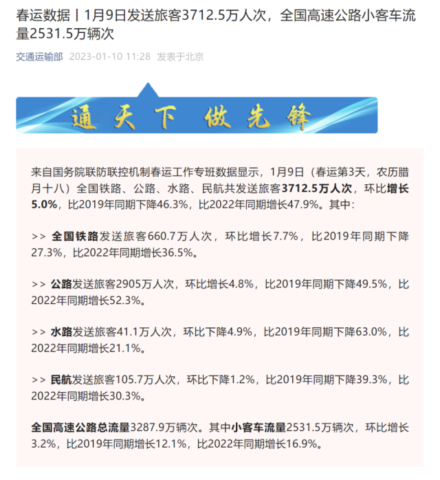 來自國務院聯(lián)防聯(lián)控機制春運工作專班數(shù)據(jù)顯示,1月9日(春運第3天,農(nóng)歷臘月十八)全國鐵路、公路、水路、民航共發(fā)送旅客3712.5萬人次,環(huán)比增長5.0%,比2019年同期下降46.3%,比2022年同期增長47.9%。其中: