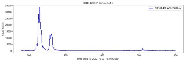 國(guó)家天文臺(tái)和上海技術(shù)物理研究所研制的EP探路者龍蝦眼X射線成像儀(LEIA)于10月12日也成功對(duì)這一伽馬射線暴開(kāi)展了觀測(cè),探測(cè)到了伽馬射線暴X射線余輝。這也是國(guó)際上首次用龍蝦眼型X射線望遠(yuǎn)鏡探測(cè)到伽馬射線暴。