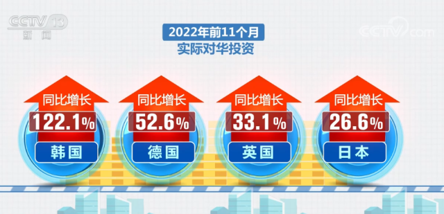 2022年前9個(gè)月,中國(guó)吸收外資規(guī)模就達(dá)到1萬億元;前11個(gè)月,突破1.15萬億元,超過2021年全年水平;與此同時(shí),外資來源更加多元。2022年前11個(gè)月,韓國(guó)、德國(guó)、英國(guó)、日本等國(guó)家的實(shí)際對(duì)華投資同比分別增長(zhǎng)122.1%、52.6%、33.1%和26.6%。