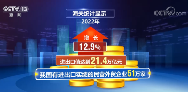 海關(guān)統(tǒng)計顯示,2022年,我國有進出口實績的民營外貿(mào)企業(yè)51萬家,進出口值達(dá)到21.4萬億元,增長12.9%。2022年,民營企業(yè)進出口規(guī)模所占比重達(dá)到了50.9%,較上年提高2.3個百分點,對我國外貿(mào)增長的貢獻(xiàn)率達(dá)80.8%。
