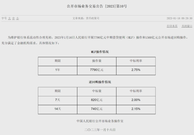 其中,MLF操作期限為1年,中標利率2.75%;7天期逆回購操作中標量為820億元,中標利率2%;14天期逆回購操作中標量為740億元,中標利率2.15%。