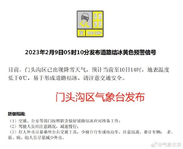 另外,目前石景山、門頭溝、延慶區(qū)氣象臺(tái)已發(fā)布道路結(jié)冰黃色預(yù)警信號(hào),上述區(qū)域已出現(xiàn)降雪,易形成道路結(jié)冰,請(qǐng)大家出行注意交通安全。