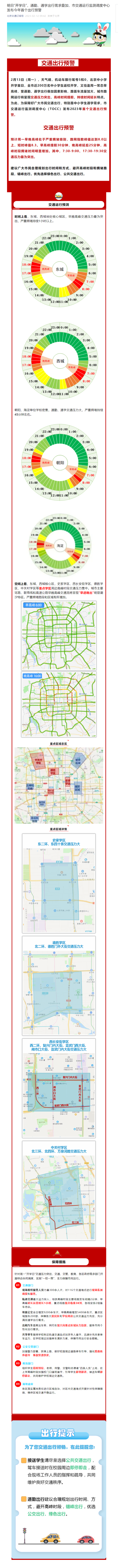 央視網(wǎng)消息:據(jù)“北京交通訂閱號”微信公眾號消息,2月13日(周一),天氣晴,機(jī)動車限行尾號5和0,北京中小學(xué)開學(xué)首日,全市近200萬名中小學(xué)生返校開學(xué),又恰逢周一常態(tài)早高峰,受通勤、通學(xué)出行疊加因素影響,路面車流量加大,城市路網(wǎng)運(yùn)行將呈現(xiàn)交通壓力突出,高峰時(shí)間提前,持續(xù)時(shí)間延長特點(diǎn)。為此,為保障好廣大市民交通出行,特別是中小學(xué)生通學(xué)需求,市交通運(yùn)行監(jiān)測調(diào)度中心(TOCC)發(fā)布2023年首個(gè)交通出行預(yù)警。