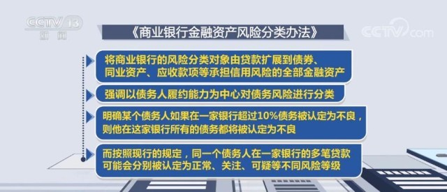 辦法還要求商業(yè)銀行應至少每季度對全部金融資產(chǎn)進行一次風險分類,有效防范化解信用風險。這一辦法將從今年7月1日起施行。