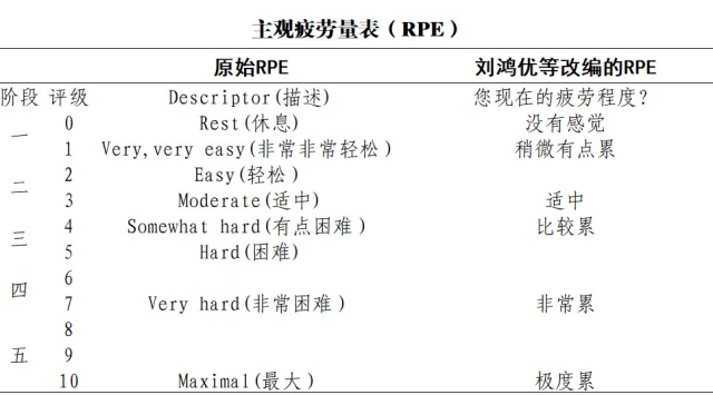 使用主觀疲勞感知評估量表,作為逐步提高活動水平的指南。該量表是世界衛(wèi)生組織在《新冠病毒相關(guān)疾病康復指導手冊》對感染后患者通過記錄日?;顒右约爸饔^疲勞量表評分(RPE值)來監(jiān)控自身的狀況,并用于指導如何提高自身活動水平的量表。該量表將運動中主觀感受的費力程度劃分為0分(完全不費力)到10分(最大程度的用力),即RPE值0~10分。