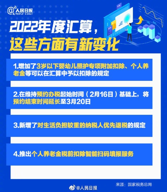 2022年度個(gè)稅匯算將于3月1日起開(kāi)始,2月16日起可以提前預(yù)約辦稅。納稅人如需在3月1日至3月20日之間辦理年度匯算,可在2月16日至3月20日每天的早6點(diǎn)至晚22點(diǎn)登錄手機(jī)個(gè)人所得稅APP進(jìn)行預(yù)約。2022年度退補(bǔ)稅怎么辦理?2022年度匯算新變化又有哪些?詳戳