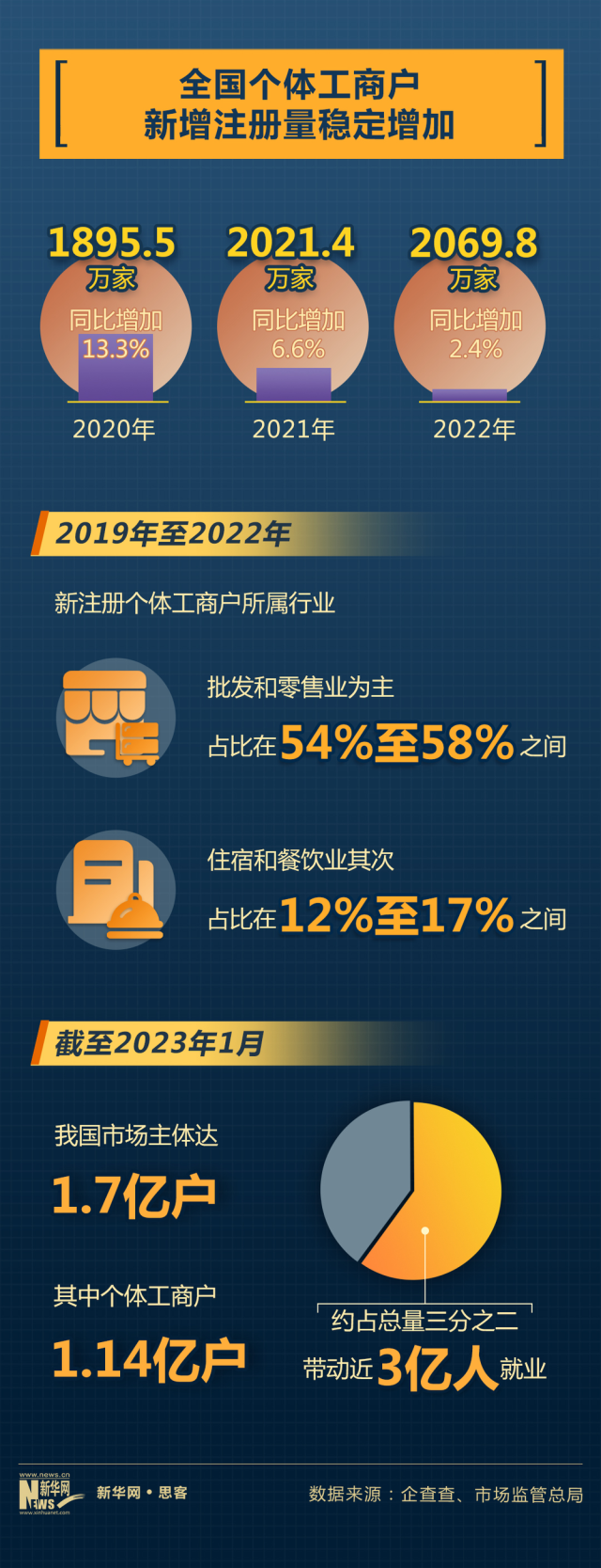 近日市場監(jiān)管總局統(tǒng)計顯示,截至2023年1月,我國市場主體達(dá)1.7億戶,其中個體工商戶1.14億戶,約占總量三分之二,帶動近3億人就業(yè)。