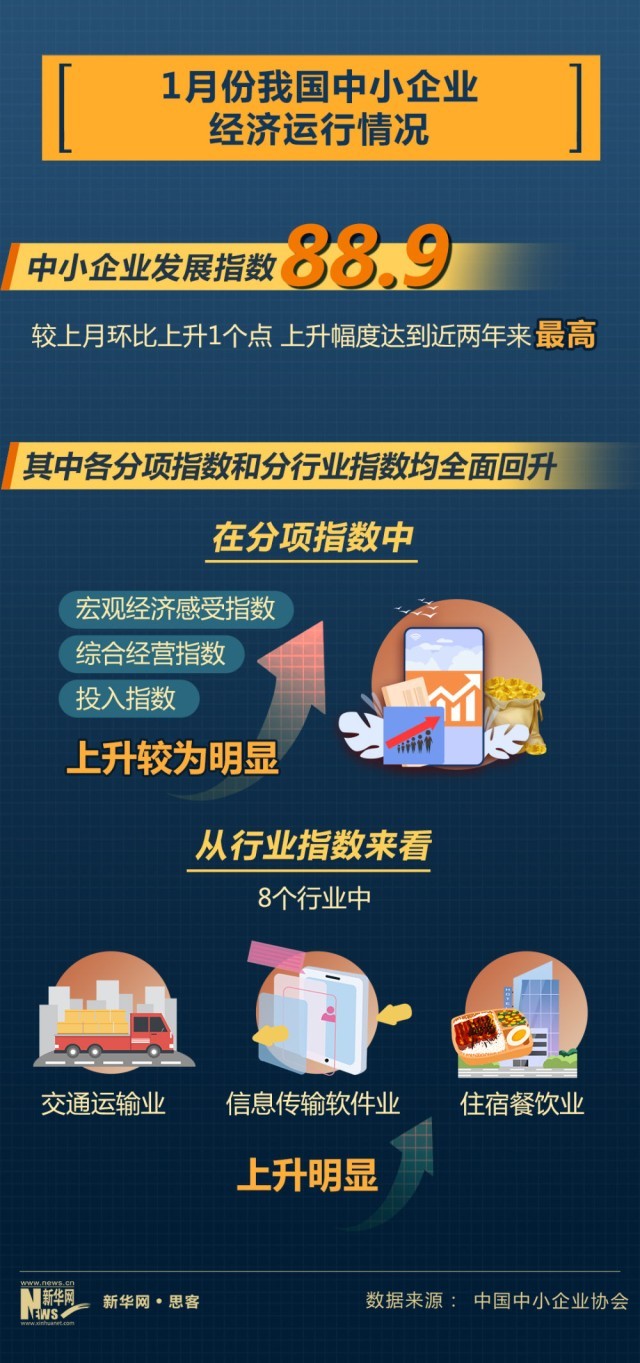 近日中國中小企業(yè)協(xié)會公布我國中小企業(yè)經(jīng)濟(jì)運(yùn)行情況。2023年1月份,中國中小企業(yè)發(fā)展指數(shù)為88.9,比去年12月回升1個點(diǎn),上升幅度達(dá)到近兩年來最高。其中,企業(yè)發(fā)展信心回升,反映企業(yè)信心狀況的宏觀經(jīng)濟(jì)感受指數(shù)為98.7,比上月上升2.1點(diǎn)。市場預(yù)期有所提振,市場指數(shù)為80.7,環(huán)比上升0.9點(diǎn)。