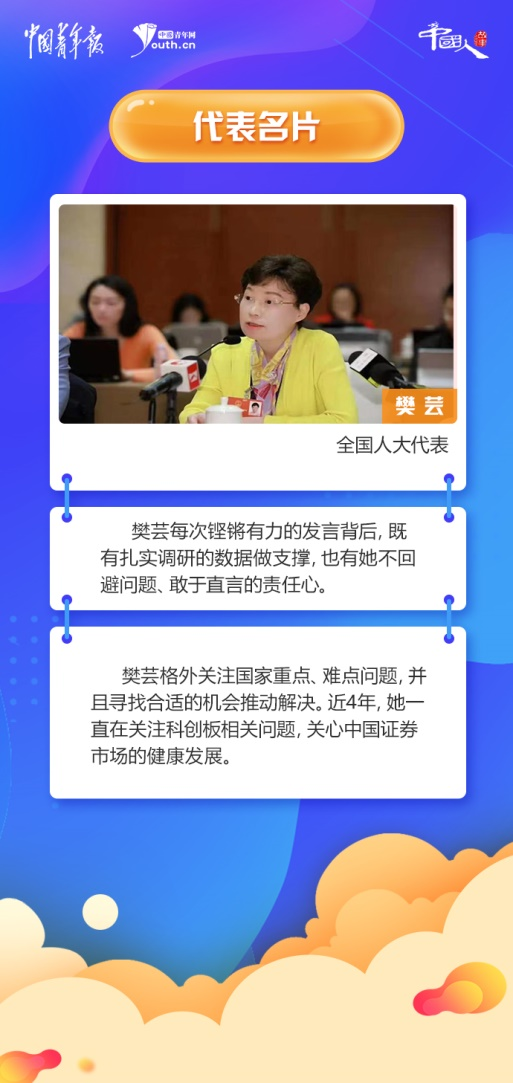 2020年,在十三屆全國人大三次會議上,她提出改革不適應(yīng)的監(jiān)管模式、依法實(shí)施注冊備案制等7條建議,推動了新版證券法改革落地。