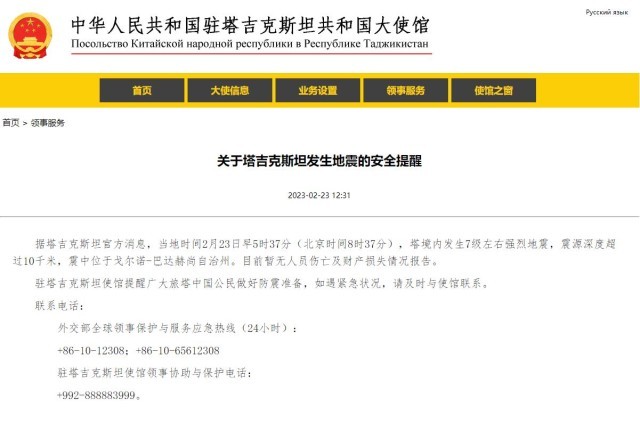 駐塔吉克斯坦使館提醒廣大旅塔中國(guó)公民做好防震準(zhǔn)備,如遇緊急狀況,請(qǐng)及時(shí)與使館聯(lián)系。