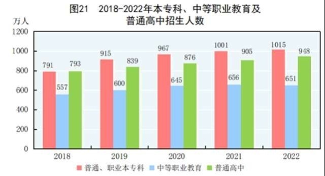 全年研究生教育招生124.2萬(wàn)人,在學(xué)研究生365.4萬(wàn)人,畢業(yè)生86.2萬(wàn)人。普通、職業(yè)本專科招生1014.5萬(wàn)人,在校生3659.4萬(wàn)人,畢業(yè)生967.3萬(wàn)人。中等職業(yè)教育招生650.7萬(wàn)人,在校生1784.7萬(wàn)人,畢業(yè)生519.2萬(wàn)人。普通高中招生947.5萬(wàn)人,在校生2713.9萬(wàn)人,畢業(yè)生824.1萬(wàn)人。初中招生1731.4萬(wàn)人,在校生5120.6萬(wàn)人,畢業(yè)生1623.9萬(wàn)人。普通小學(xué)招生1701.4萬(wàn)人,在校生10732.0萬(wàn)人,畢業(yè)生1740.6萬(wàn)人。特殊教育招生14.6萬(wàn)人,在校生91.9萬(wàn)人,畢業(yè)生15.9萬(wàn)人。學(xué)前教育在園幼兒4627.5萬(wàn)人。九年義務(wù)教育鞏固率為95.5%,高中階段毛入學(xué)率為91.6%。