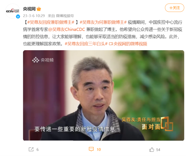 疫情期間,吳尊友兼職做起了博主。他希望向公眾傳遞一些關(guān)于新冠疫情的防控信息,讓大家能夠理解,也能夠采取適當?shù)姆酪叽胧?,減少感染風險。此外,也能更理解國家政策。