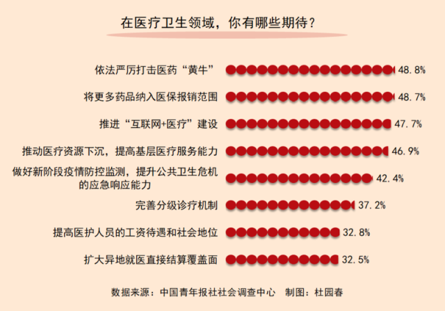 在醫(yī)療衛(wèi)生領(lǐng)域,大家有哪些期待?調(diào)查顯示,依法嚴(yán)厲打擊醫(yī)藥“黃?!保?8.8%)的呼聲最高,其次是將更多藥品納入醫(yī)保報(bào)銷范圍(48.7%),然后是:推進(jìn)“互聯(lián)網(wǎng)+醫(yī)療”建設(shè)(47.7%)和推動(dòng)醫(yī)療資源下沉,提高基層醫(yī)療服務(wù)能力(46.9%)。