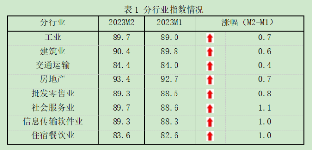 2月份,隨著經(jīng)濟(jì)逐步恢復(fù),8個(gè)行業(yè)指數(shù)均連續(xù)兩個(gè)月上升。服務(wù)業(yè)指數(shù)恢復(fù)速度領(lǐng)先,其中,社會服務(wù)業(yè)、信息傳輸計(jì)算機(jī)服務(wù)軟件業(yè)、住宿餐飲業(yè)和批發(fā)零售業(yè)指數(shù)分別上升1.1、1.0、1.0和0.8點(diǎn)。