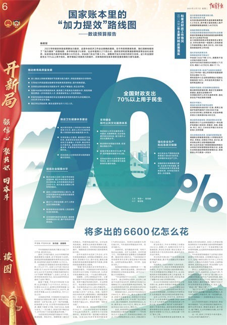 3月7日,《中國青年報(bào)》兩會(huì)特刊推出可視化版面解讀預(yù)算報(bào)告中的重要數(shù)據(jù)“70%”——連續(xù)5年全國財(cái)政支出70%以上用于民生。通過突出這一大數(shù)據(jù),凸顯本屆政府執(zhí)政為民的理念。整版通過數(shù)據(jù)的變化,解讀預(yù)算報(bào)告,呈現(xiàn)“積極財(cái)政政策提力增效的路線圖”。