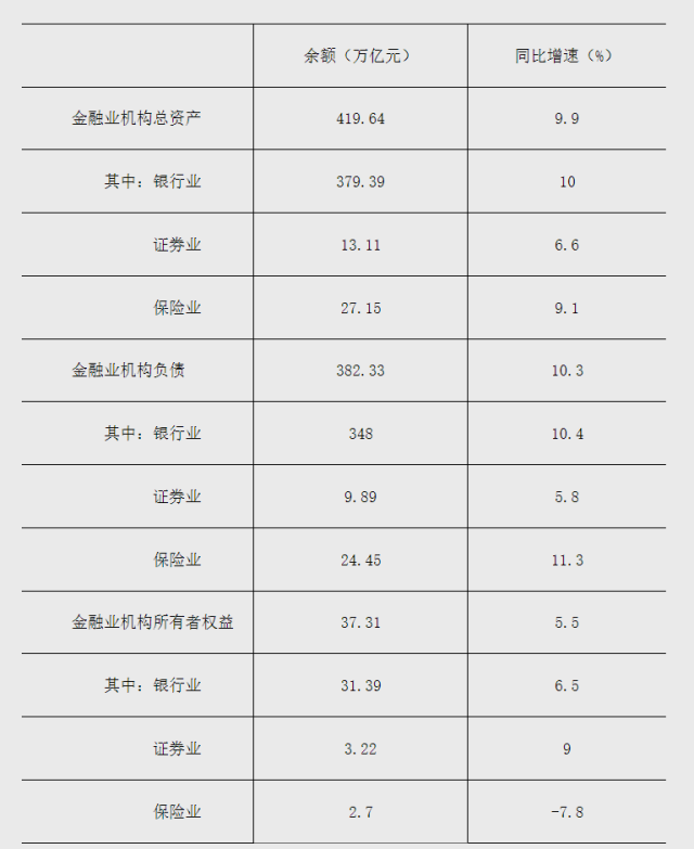 注1:金融業(yè)機構總資產、負債和所有者權益是銀行業(yè)、證券業(yè)和保險業(yè)機構相應指標的匯總數。其中,銀行業(yè)機構指法人金融機構(含境外分行),不包括中央銀行;證券業(yè)機構包括證券公司、期貨公司和基金公司,證券公司和期貨公司總資產均包括自身及客戶資產;保險業(yè)機構包括財產保險公司、人身保險公司、再保險公司、保險集團公司和保險資產管理公司。