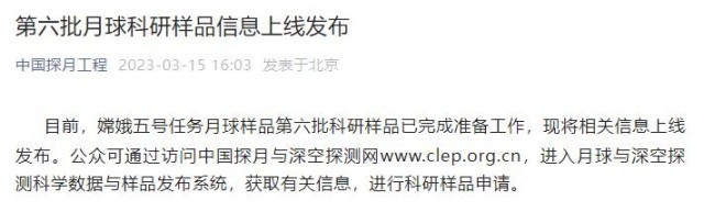 央視網(wǎng)消息:據(jù)“中國探月工程”微信公眾號消息,目前,嫦娥五號任務(wù)月球樣品第六批科研樣品已完成準備工作,現(xiàn)將相關(guān)信息上線發(fā)布。公眾可通過訪問中國探月與深空探測網(wǎng)www.clep.org.cn,進入月球與深空探測科學數(shù)據(jù)與樣品發(fā)布系統(tǒng),獲取有關(guān)信息,進行科研樣品申請。