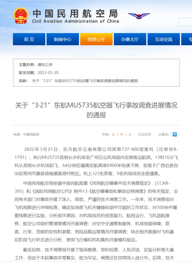 中國民航局發(fā)布《關(guān)于“3·21”東航MU5735航空器飛行事故調(diào)查進展情況的通報》