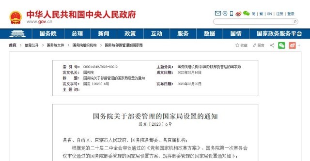 央視網消息:3月20日,《國務院關于部委管理的國家局設置的通知》發(fā)布。具體如下: