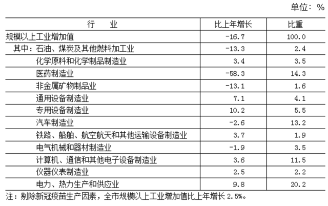 全年實(shí)現(xiàn)工業(yè)增加值5036.4億元,按不變價(jià)格計(jì)算,比上年下降14.6%。其中,規(guī)模以上工業(yè)[4]增加值下降16.7%,剔除新冠疫苗生產(chǎn)因素增長2.5%。在規(guī)模以上工業(yè)中,電力、熱力生產(chǎn)和供應(yīng)業(yè)增長9.8%,計(jì)算機(jī)、通信和其他電子設(shè)備制造業(yè)增長3.6%,汽車制造業(yè)下降2.6%,醫(yī)藥制造業(yè)下降58.3%(剔除新冠疫苗生產(chǎn)因素后增長6.4%)。規(guī)模以上工業(yè)實(shí)現(xiàn)銷售產(chǎn)值22366.3億元,下降5.7%。其中,內(nèi)銷產(chǎn)值20560.5億元,下降1.8%;出口交貨值1805.8億元,下降35.0%。