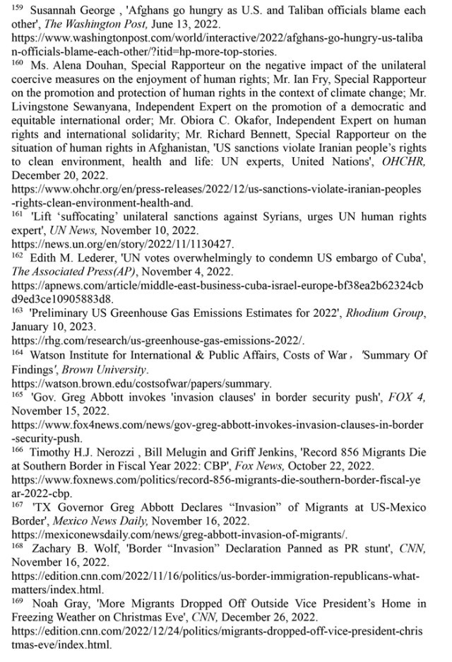 長期肆意實(shí)施單邊制裁。近年來,美國對其他國家實(shí)施的單邊制裁呈指數(shù)級增長,極大削弱了被制裁國家人權(quán)保障的能力與水平。孟加拉國《每日星報》2022年12月28日報道,美國實(shí)施的單邊制裁總數(shù)為世界之最,目前仍在對20多個國家實(shí)施制裁,包括1962年以來對古巴的制裁、1979年以來對伊朗的制裁、2011年以來對敘利亞的制裁,以及近年來對阿富汗的制裁,導(dǎo)致被制裁國家無法向其人民提供基本的食物和藥品。(注158)《華盛頓郵報》2022年6月13日報道,近一半的阿富汗人沒有足夠的食物,兒童營養(yǎng)不良呈上升趨勢。(注159)2022年12月20日,多名聯(lián)合國人權(quán)理事會獨(dú)立專家發(fā)表共同聲明指出,美國政府對伊朗的制裁加劇了伊朗的環(huán)境危害,使所有在伊朗的民眾無法充分享受健康權(quán)和生命權(quán),侵犯了伊朗人民享有清潔環(huán)境的權(quán)利。(注160)聯(lián)合國單邊強(qiáng)制措施對人權(quán)負(fù)面影響問題特別報告員阿萊娜·杜晗2022年11月10日指出,單邊制裁加劇了敘利亞人民的苦難,是對人權(quán)的嚴(yán)重侵犯。(注161)美國政府肆意實(shí)施制裁引發(fā)他國人權(quán)危機(jī)受到國際社會強(qiáng)烈譴責(zé)。2022年11月3日,聯(lián)合國大會就敦促美國終止對古巴的經(jīng)濟(jì)、商業(yè)和金融封鎖進(jìn)行投票表決。在193個成員國中,多達(dá)185個國家支持譴責(zé)美國對古巴的禁運(yùn)。(注162)這是聯(lián)合國大會連續(xù)30次通過類似決議。