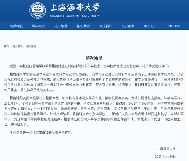 上海海事大學被舉報弄虛作假,校方發(fā)布情況通報:經(jīng)查,均不屬實